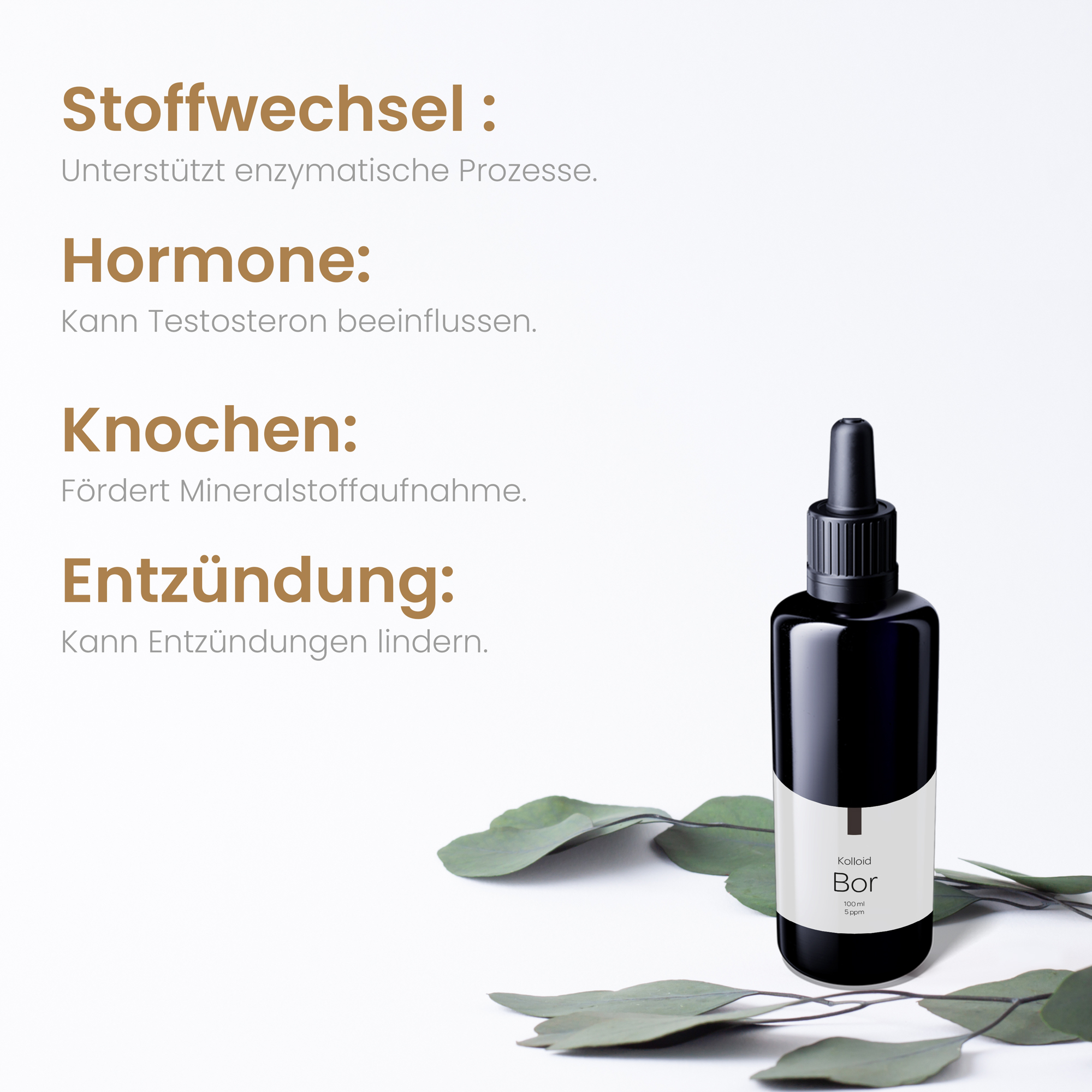Kolloidales Bor kann den körpereigenen Stoffwechsel unterstützen und wird häufig im Bereich ganzheitlicher Gesundheit geschätzt. Unsere Lösung enthält hochreines, elementares Bor (99,99 %) in entmineralisiertem Wasser – frei von Zusätzen, Konservierungsstoffen oder chemischen Bindemitteln.